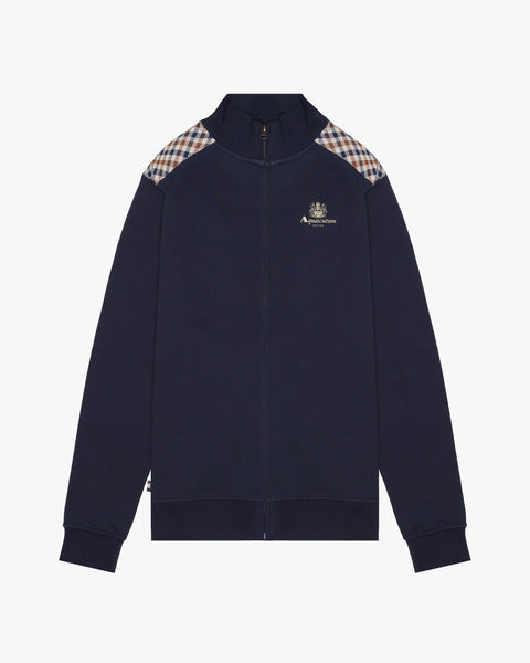 A contemporary reinterpretation of an icon, this full-zip sweatshirt is crafted in 100% cotton fleece (brushed, 330 g/m²) for comfort and warmth. The front body features a Club Check insert at shoulder height, adding a distinctive heritage touch. On the left chest, the sweatshirt is personalized with the Aquascutum Active logo and crest, highlighting its timeless identity. The double-slider YKK zip and ribbed finishes ensure functionality and a refined fit.