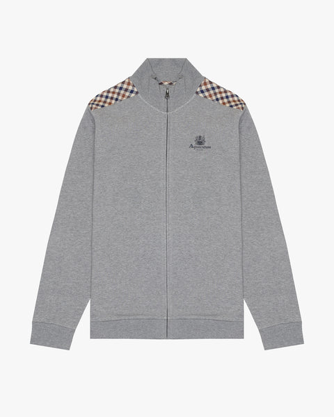 A contemporary reinterpretation of an icon, this full-zip sweatshirt is crafted in 100% cotton fleece (brushed, 330 g/m²) for comfort and warmth. The front body features a Club Check insert at shoulder height, adding a distinctive heritage touch. On the left chest, the sweatshirt is personalized with the Aquascutum Active logo and crest, highlighting its timeless identity. The double-slider YKK zip and ribbed finishes ensure functionality and a refined fit.