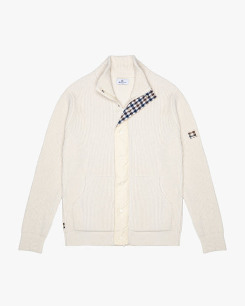 A hybrid essential designed for comfort, structure and protection. This knit is crafted in 100% lambswool with technical Nylon Crepe details on the mockneck collar and buttoned front placket, which conceals a full-length zip closure. Rubberised buttons with Aquascutum Active branding add a tactile, functional edge. A kangaroo-style front pocket, knitted in lambswool, enhances its practical attitude while maintaining softness and warmth. Finished with the Aquascutum Active silicone badge on the left sleeve.