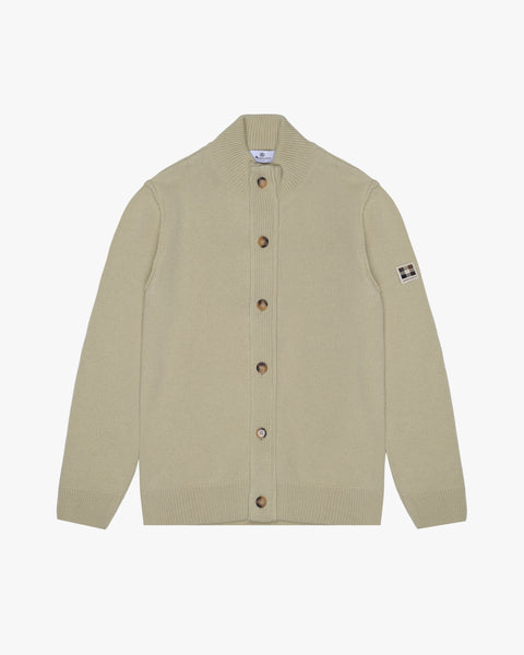 A refined alternative to classic layering. This mockneck cardigan is knitted in 100% lambswool for warmth and breathability. The front closure features a hidden full zip covered by a buttoned placket with corozo buttons — a subtle nod to heritage tailoring. Versatile and clean-lined, it’s designed for comfort with a structured look.