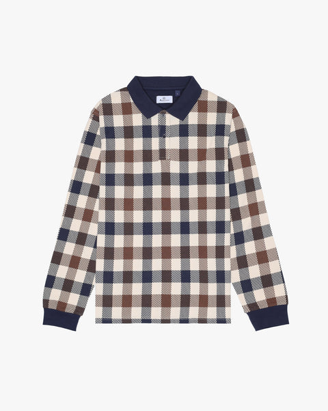 A long-sleeved interpretation of our Macro Club Check Polo. Crafted from 100% combed cotton piquet with the bold Macro Club Check pattern, it is detailed with a navy ribbed collar and cuffs for contrast. An iconic piece that merges Aquascutum’s heritage codes with a modern and versatile outlook.
