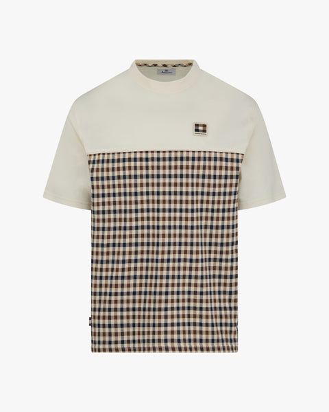 This short-sleeve T-shirt reinterprets a classic silhouette through a bold yet refined Aquascutum Active lens. Made from premium cotton single jersey, it ensures comfort and breathability throughout the day. The design features a distinctive Club Check fabric panel across the front, creating a strong visual contrast while celebrating the brand’s iconic pattern. Finished with a crew neck, short sleeves and a regular fit, this piece stands out as a statement casual essential.