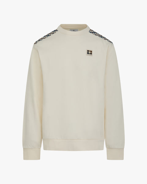 The design mirrors the essential construction of the Small Logo Crewneck, enhanced by a contrast Club Check insert in laminated fabric, applied along the shoulder panels. This detail introduces a subtle technical and visual contrast while preserving the garment’s understated identity. Finished with ribbed trims and a classic crewneck silhouette, it stands as a modern interpretation of Aquascutum Active heritage.