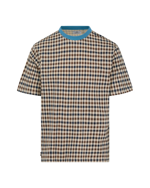 A contemporary T-shirt that fully expresses Aquascutum Active identity through an all-over Club Check design. Crafted from soft cotton jersey, this short-sleeve style combines visual impact with everyday comfort. The classic crew neck is finished with a contrast rib collar that adds a sporty accent, while the clean construction and regular fit ensure versatility for active urban wear. A statement piece that blends heritage patterning with a modern Active attitude.
